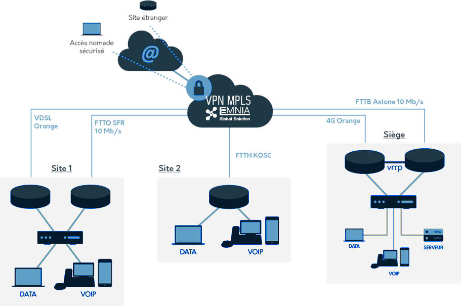 Mise en place d'un pare-feu Fortinet, configuration des VPN IPsec inter-sites, Wifi avec authentification RADIUS et intégration des dispositifs d'accès physique pour relier géographiquement plusieurs sites de l'entreprise.